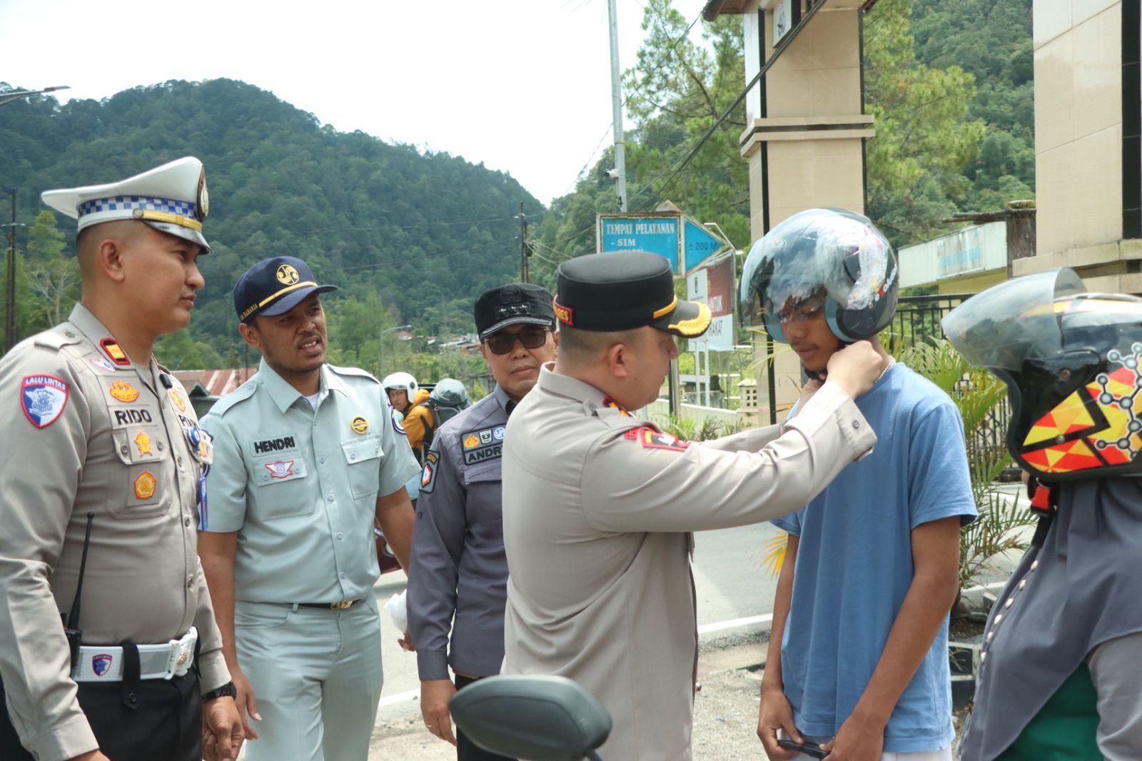KABAMINANG.com, Solok, 24 September 2025 – Dalam rangka memperingati Hari Lalu Lintas, Kepolisian Resor (Polres) Solok melaksanakan kegiatan berbagi helm gratis kepada pengendara yang patuh terhadap aturan berlalu lintas. Kegiatan ini dipimpin langsung oleh Kapolres Solok AKBP Agung Pranajaya, S.I.K., bersama Kasat Lantas Polres Solok IPTU Rido, S.H., M.H., Kepala Cabang Samsat Arosuka, serta Kepala Jasa Raharja Kabupaten Solok beserta jajaran.