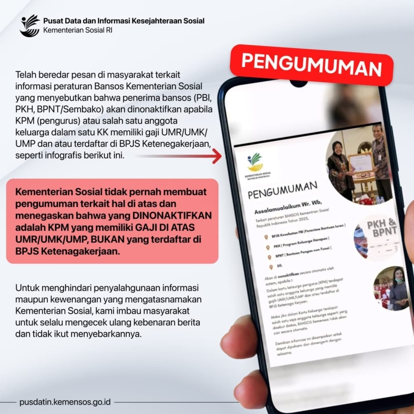 “Dapat ditegaskan bahwa menjadi peserta BPJS Ketenagakerjaan bukan alasan pencabutan bansos,” katanya.