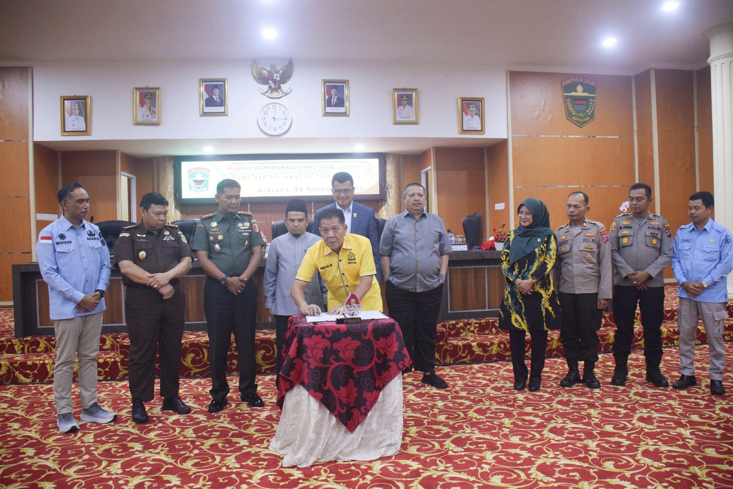 Rapat paripurna dipimpin langsung oleh Ketua DPRD Kabupaten Solok, Ivoni Munir, didampingi Wakil Ketua Armen Plani dan Muklis. Dalam sidang tersebut dilakukan penyampaian laporan hasil pembahasan, persetujuan penetapan Ranperda menjadi Perda, serta penandatanganan berita acara persetujuan bersama antara DPRD dan Pemerintah Kabupaten Solok.