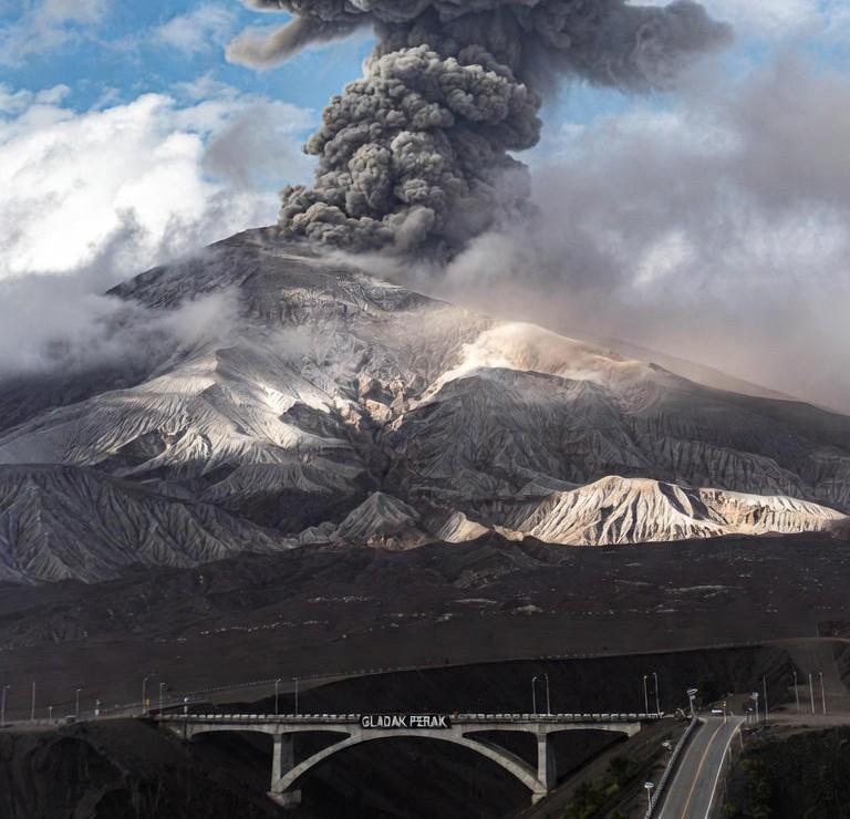 “Hentikan lalu lintas sementara, jangan memasuki area. Abu tebal hingga tak terlihat apa-apa.”