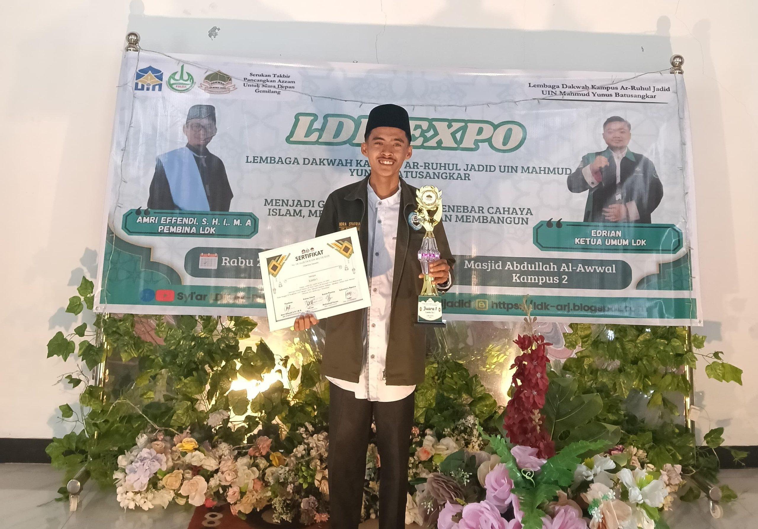 Melalui Kompetisi DA’I Nasional Yang diselenggarakan oleh LDK ARJ UIN Mahmud Yunus Batusangkar indra Syafriandi berhasil meraih juara 1